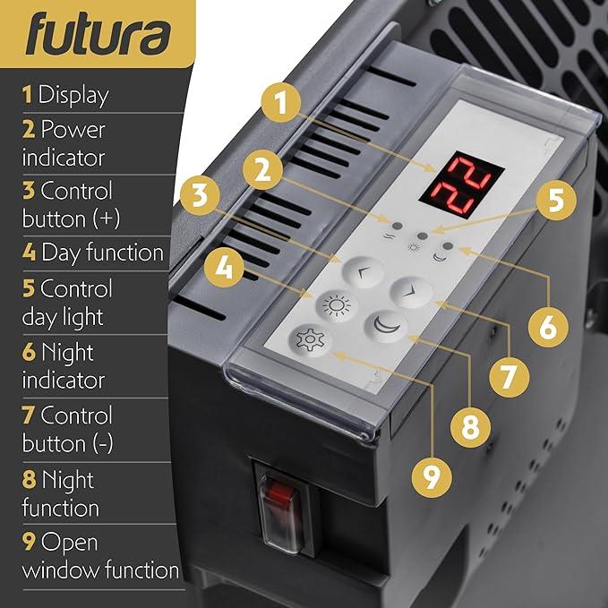 ・Energy Saving: The Futura electric heaters for home enables you to set your desired temperature between 5°C to 35°C and with our eco auto open window detection - This is an automatic built in function which if the room heater detects a sudden drop of 5 degrees or more in room temperature it switches itself off.