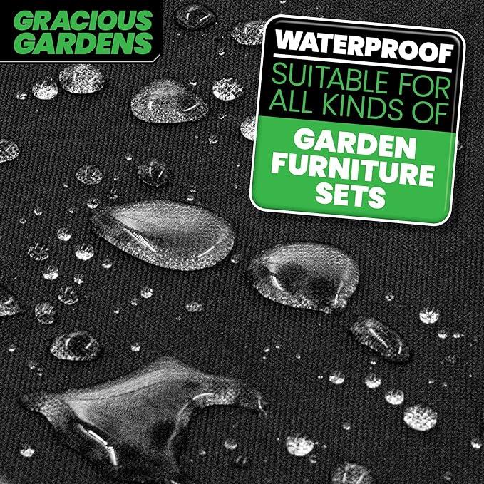 The Gracious Gardens waterproof covers for outdoor furniture are the perfect item to keep your rattan garden table and chairs protected from rain and snow throughout the winter or to keep them from fading from the UV rays in the summer. The outdoor patio covers are manufactured from Heavy Duty Oxford Fabric and boast an extra strength PVC backing making it one of the most durable garden furniture covers in the market. With its black aesthetic design, it not only provides comprehensive protection but also enhances the look of your outdoor space. The outdoor sofa covers are uniquely designed to withstand water pressure up to 8000 PA. This high-water resistance combined with its weatherproof design ensures your garden table and chairs stay dry and clean, regardless of the weather. The cover is also windproof, with included buckles and drawstrings that keep it firmly in position, even in the stormiest conditions.