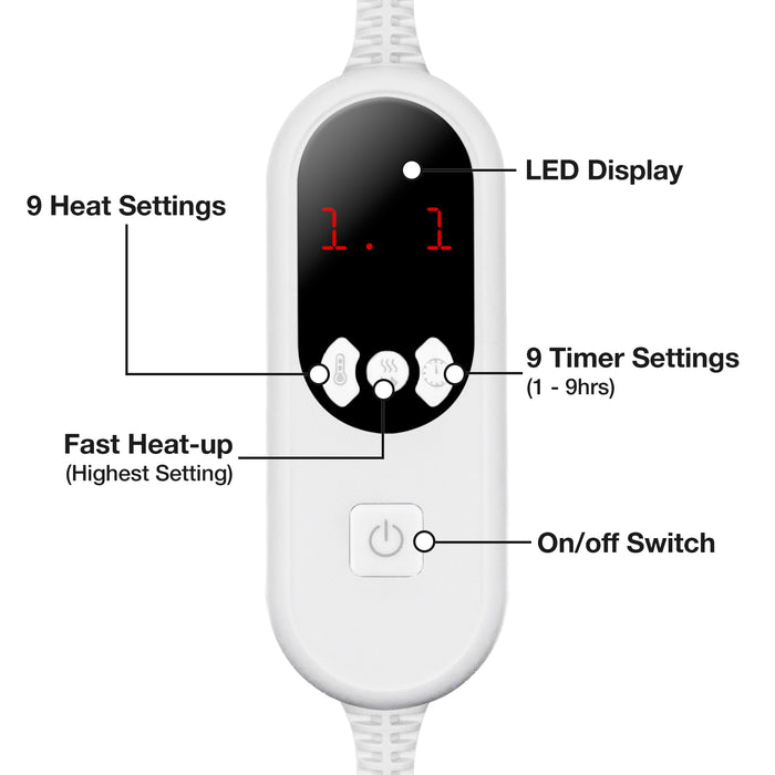 Providing great flexibility by allowing you to set the auto shut-off for either one or nine hours later, making it perfect for short spells and overnight use, auto shut off for your safety and peace of mind. The electric blanket includes 9 heating levels, while an easy-to-operate control makes it simple to find exactly the right setting.
