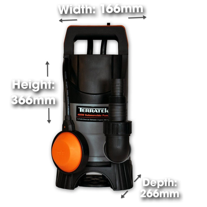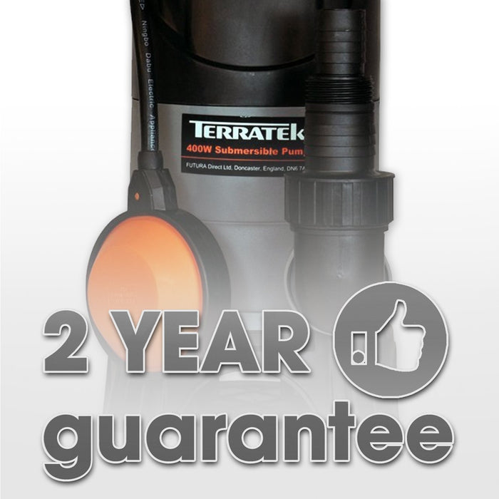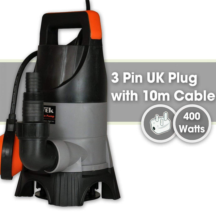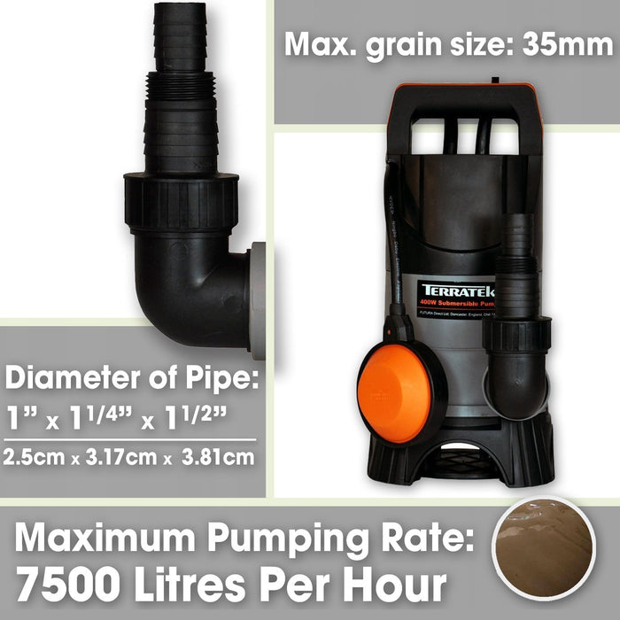 Terratek 400w Submersible Dirty Water Pumps, come with an automatic float switch for level control. Delivers 125-Litres/min. Also includes step adapter & elbow. Suitable for 1", 1¼ " & 1½ " Pipe. The max pumping rate is 7500L/h and the max particle size that can pass through the pump is 35mm. Can be used for pond cleaning, pools & flooded areas. This submersible dirty water pump comes with a 10M cable for long draws.
