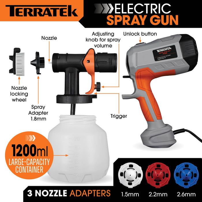 Powerful 600W Motor & 1200ML Capacity: The Terratek paint sprayer features a 600W motor to boost productivity, helping you finish projects faster. Its large 1200ML detachable container reduces the need for frequent refills. The lightweight design (1.6kg) and 2m electric cable with UK 3-pin plug make it easy to handle.